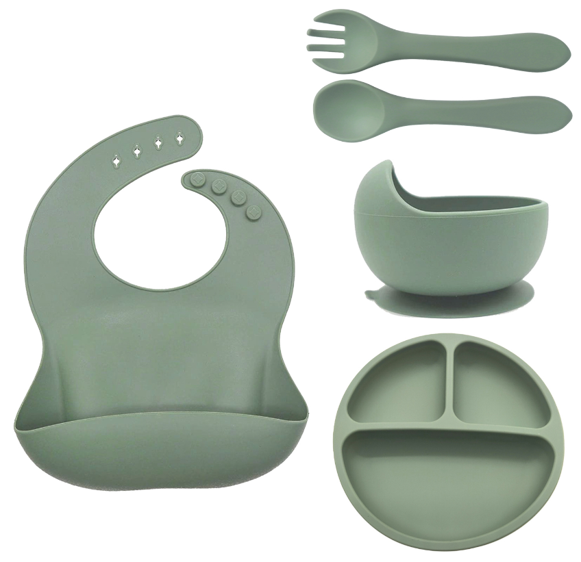 Silikon sett við tallerk, skál, gaffil, skeið og bringuklút. Lætt og einfalt til allar máltíðir, trygt og gott til smáar hendur. Lætt at reingerða.