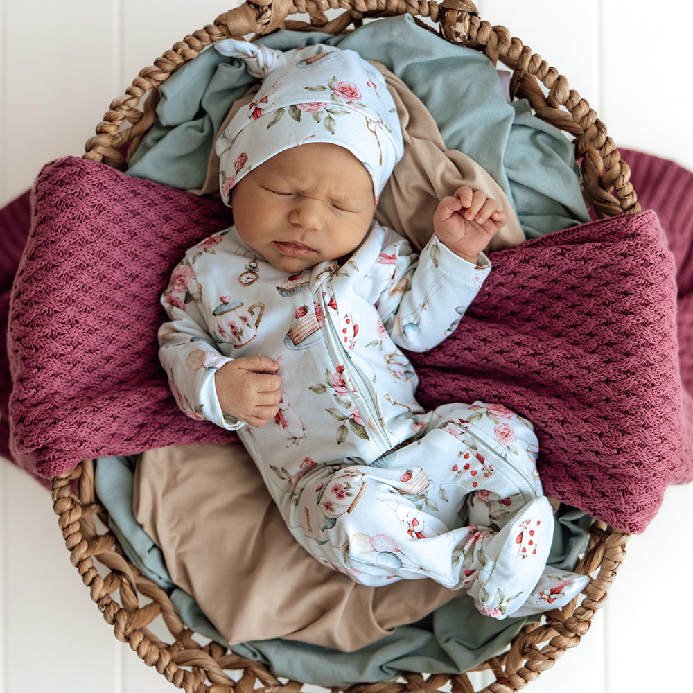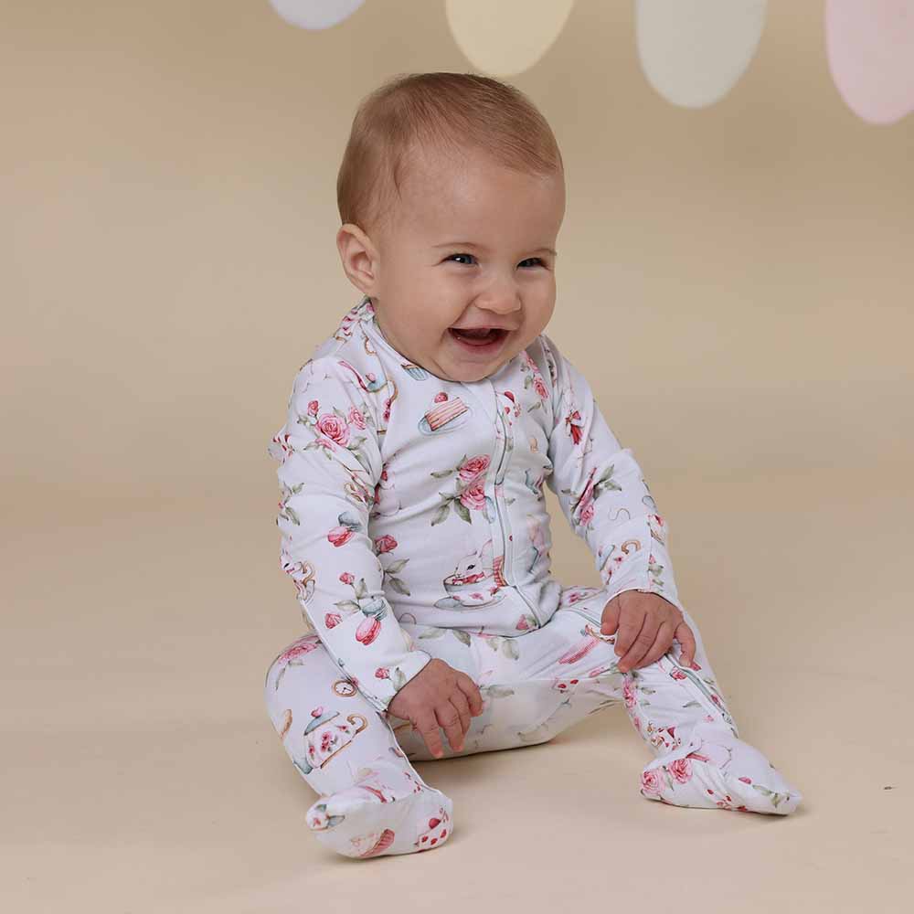 Snuggle Hunny náttdrakt við vøkrum White Rabbit prenti, lýnlási og føtrum. Mjúk og toyggilig úr bleytum og lekkrum, vistfrøðiligum bummulli.
